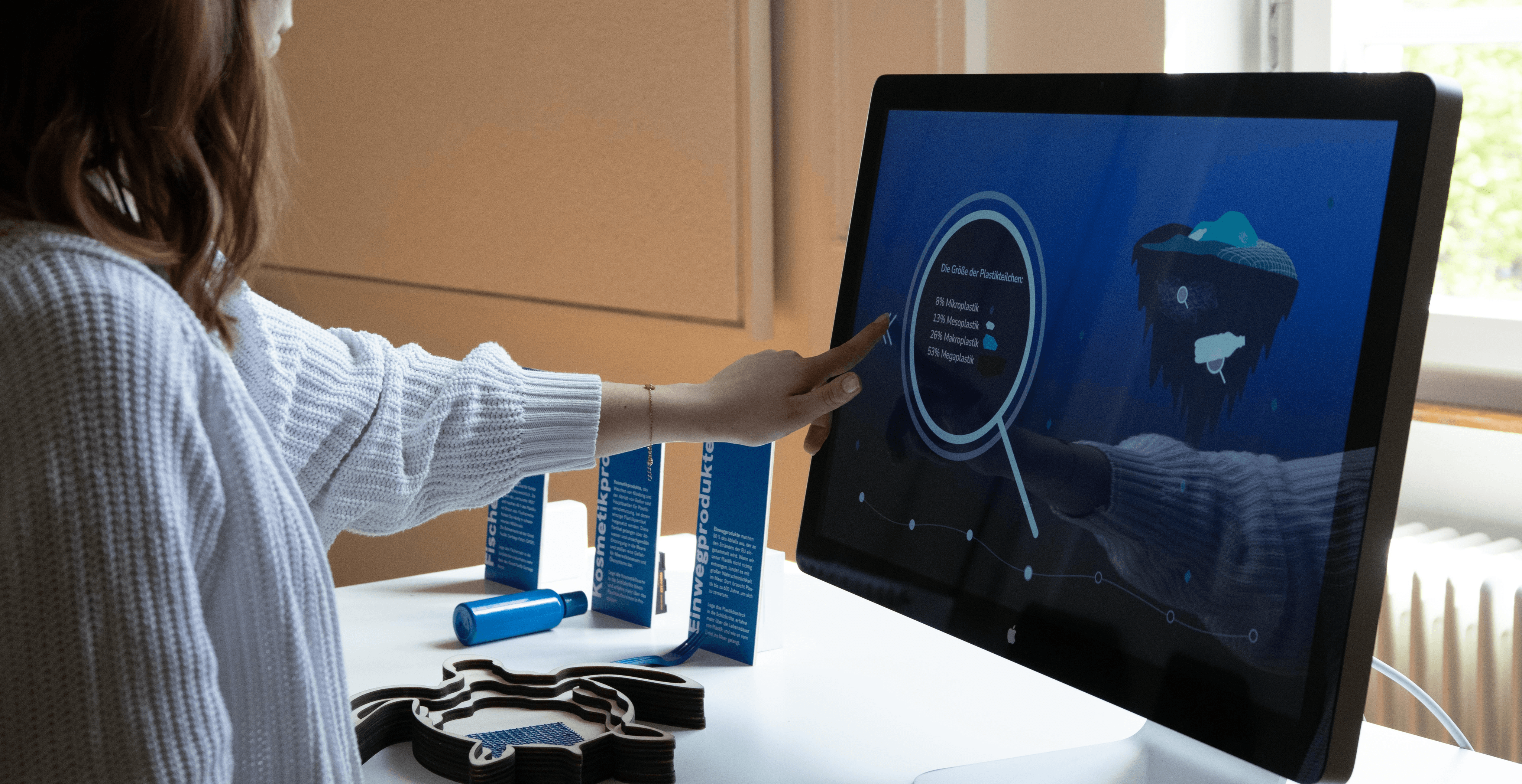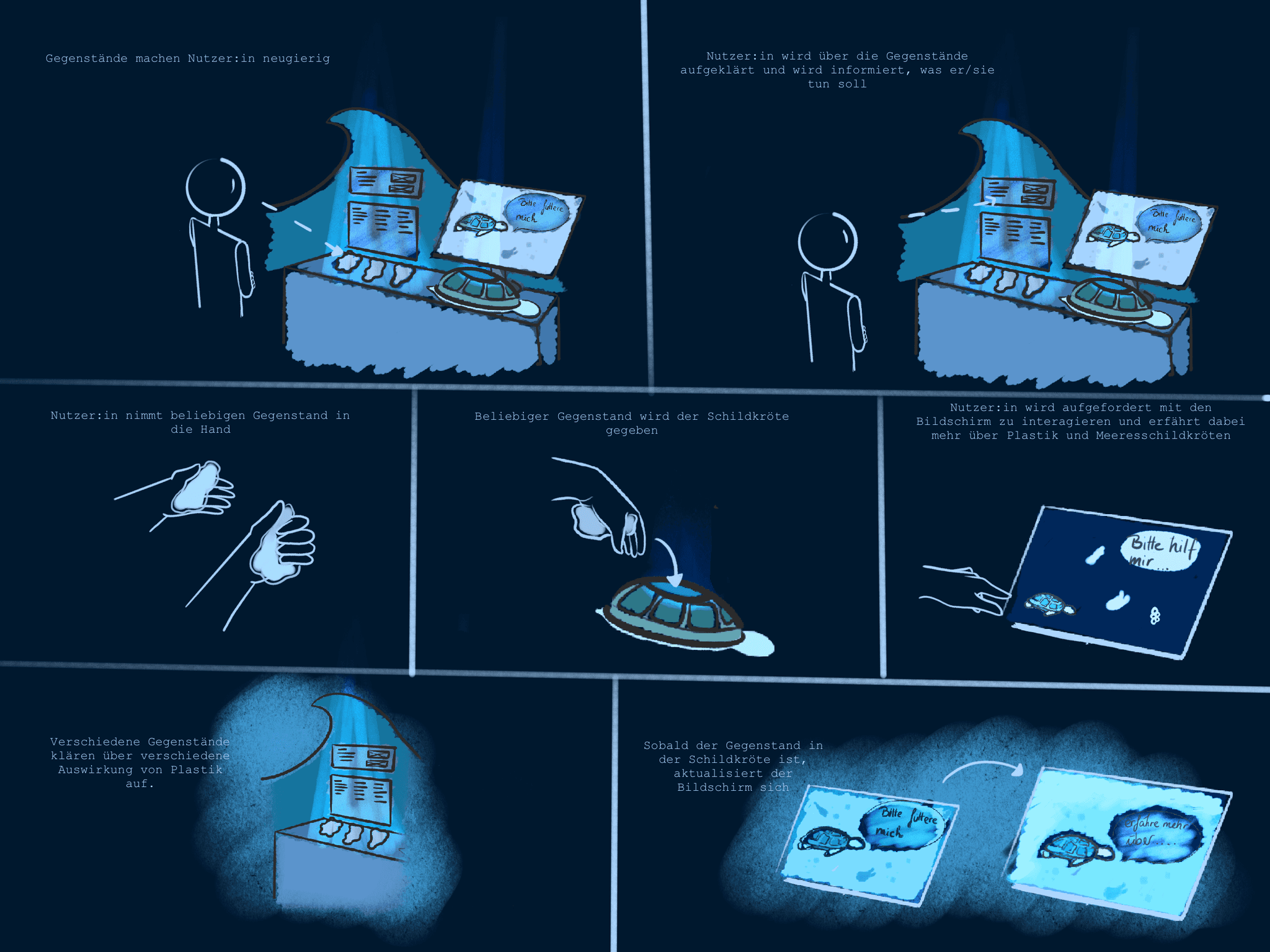 This project aims to develop an interactive exhibition system to address ocean plastic pollution and its impact on sea turtles. Visitors can place plastic items into a sculptural sea turtle, triggering a screen to display informative content about the plastic and its effects on sea turtles.